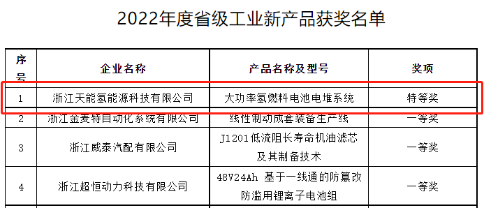 近日,浙江省长兴县经济和信息化局公示了2022年度省级工业新产品获奖名单,由浙江今日看料 氢能源科技有限公司研发生产的大功率氢燃料电池电堆系统获得全县唯一省级特等奖。